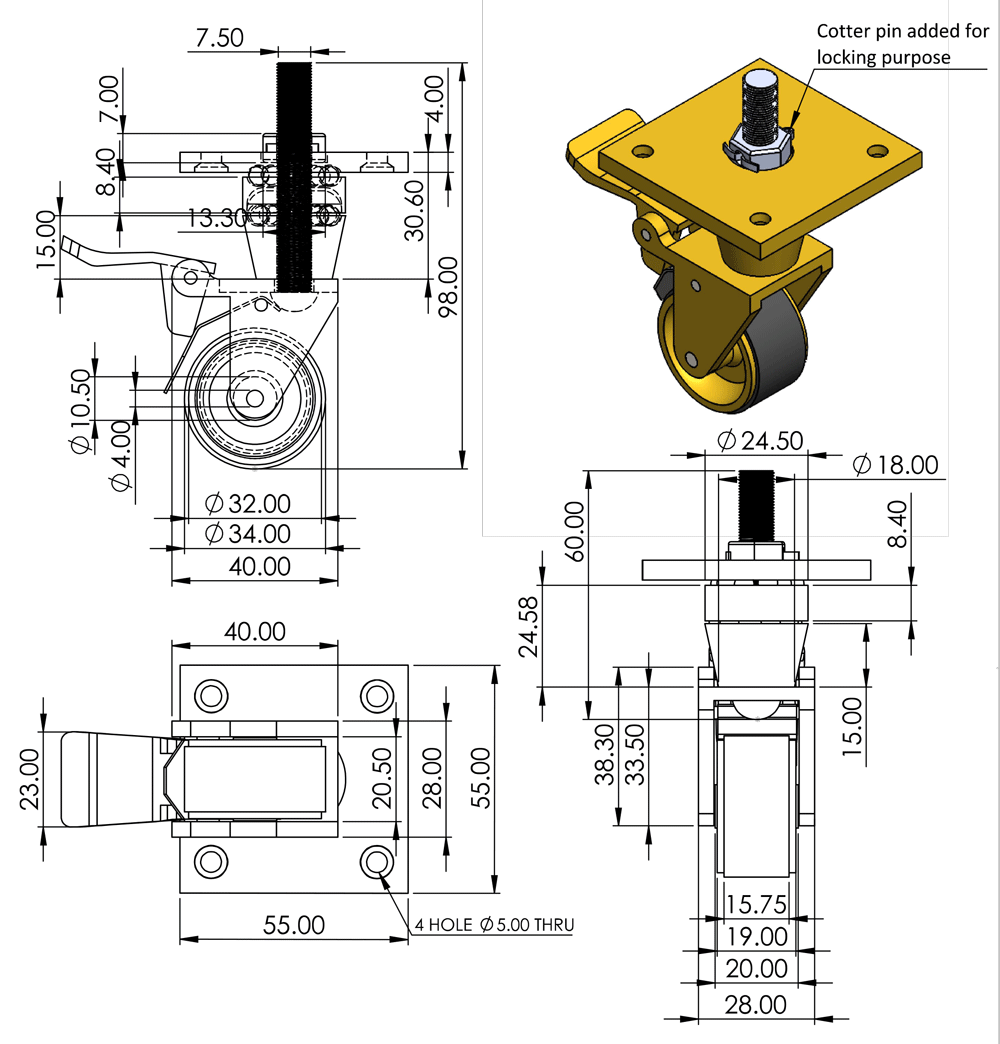 For this Brake Castor with Full Rubber Tyre, the diameter of the brass wheel is 32mm